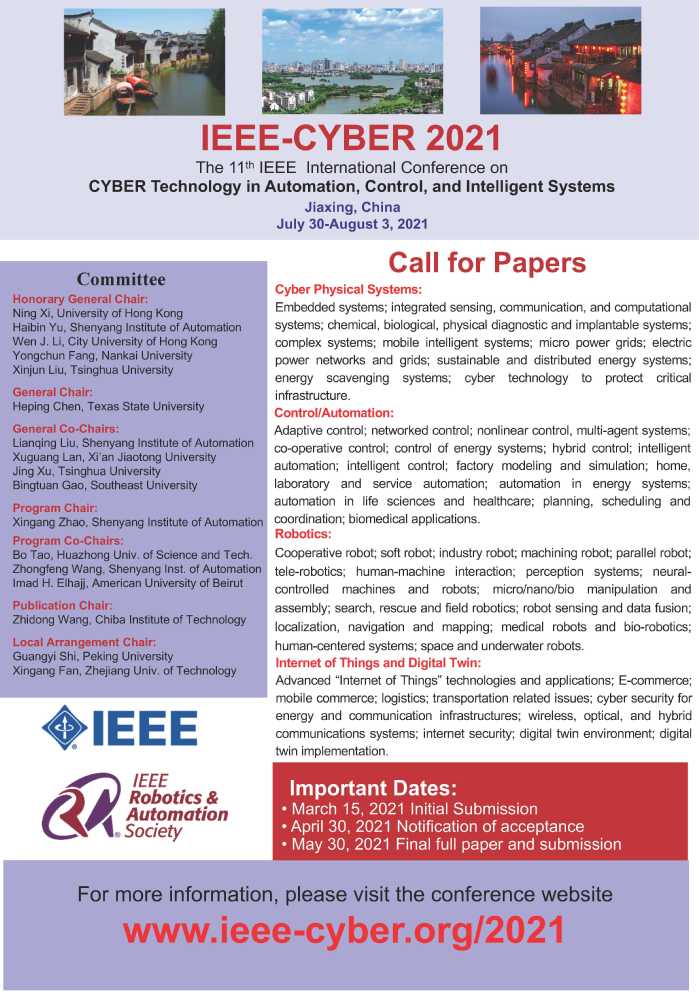 The IEEE Cyver 2021 will be held in Jiaxing on July30-Aug. 3. The submission deadline is March 15. Come and get together in Jiaxing!