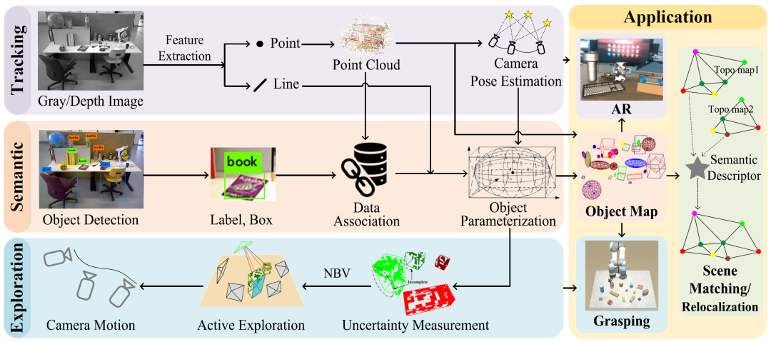 该论文的题目为《An Object SLAM Framework for Association, Mapping, and High-Level Tasks》,文中提出了一个完整的物体级SLAM(Simultaneous Localization and Mapping)框架。首先提出了用于数据关联、物体参数化和语义地图创建的关键技术,然后基于创建的物体地图探究了在多项下游任务中应用,包括机械臂主动探索与物体抓取、增强现实、场景图匹配与语义重定位。这项研究为物体级SLAM的理论构建与SLAM在真实环境中的应用提供了新的思路和解决方案。
