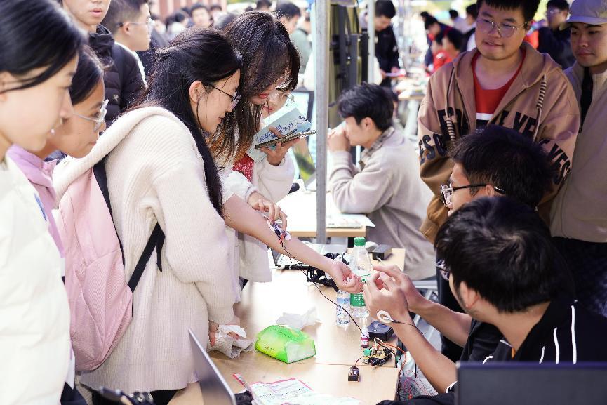 开幕式后,与会嘉宾和师生到各活动展区参观体验。活动现场展示了学院最新的科研成果,包括工业机器人、水下机器人、无人驾驶系统等,师生亦可操作智能车、铣削雕刻设备,感受机器人的魅力。此外,现场还设置了 “AI脑洞大开,你说我猜趣挑战”“足球机器人点球狂欢”等游戏展区,吸引了大量师生参与互动。